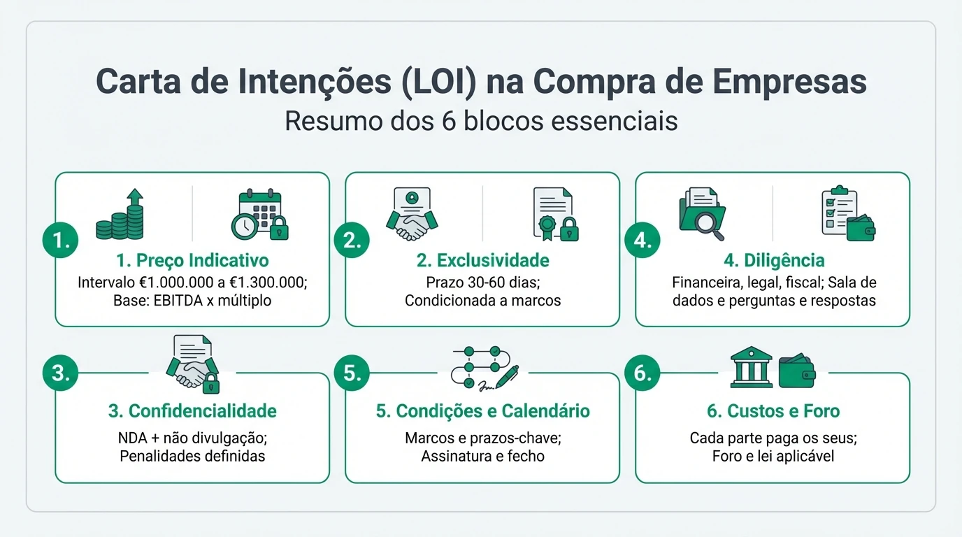 Infográfico com os 6 blocos essenciais de uma LOI: preço indicativo, exclusividade, confidencialidade, due diligence, condições e calendário, custos e foro
